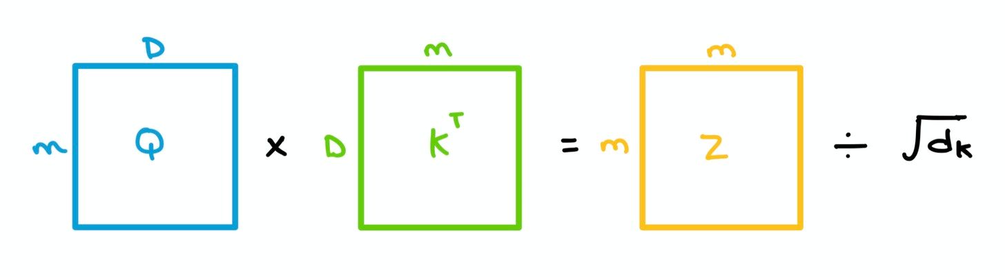 - A dot product is taken between each query $q$ from $Q$ and all the keys $k$ in $K$ collectively – in linear algebra terms, this means we simply multiply $Q$ and the transpose of $K$. This gives us a $m \times m$ matrix which we divide by the square root of the dimension of $K$ (64 in the paper) to give us Attention matrix $Z$.