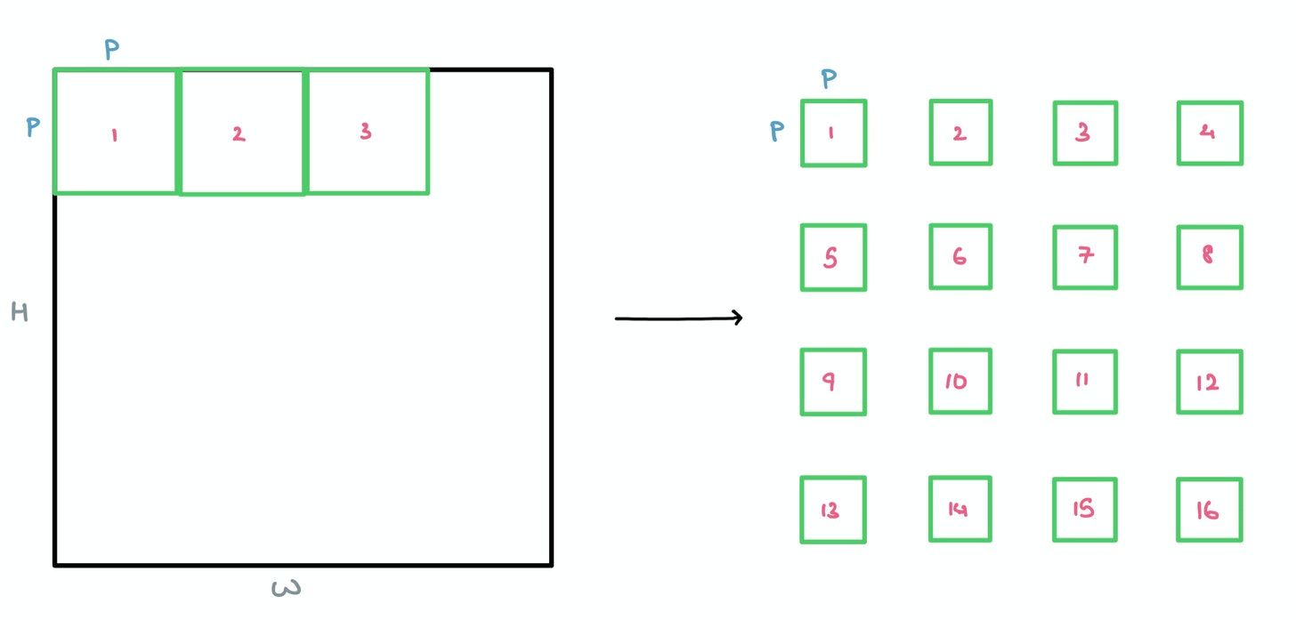 For the sake of simplicity, I’m assuming we’re working with a grayscale image with only one color channel. The same principle works with multiple channels (like RGB) – the only thing changing is the patch dimensions from $P \times P$ to $P \times P \times C$, where $C$ is the number of channels.