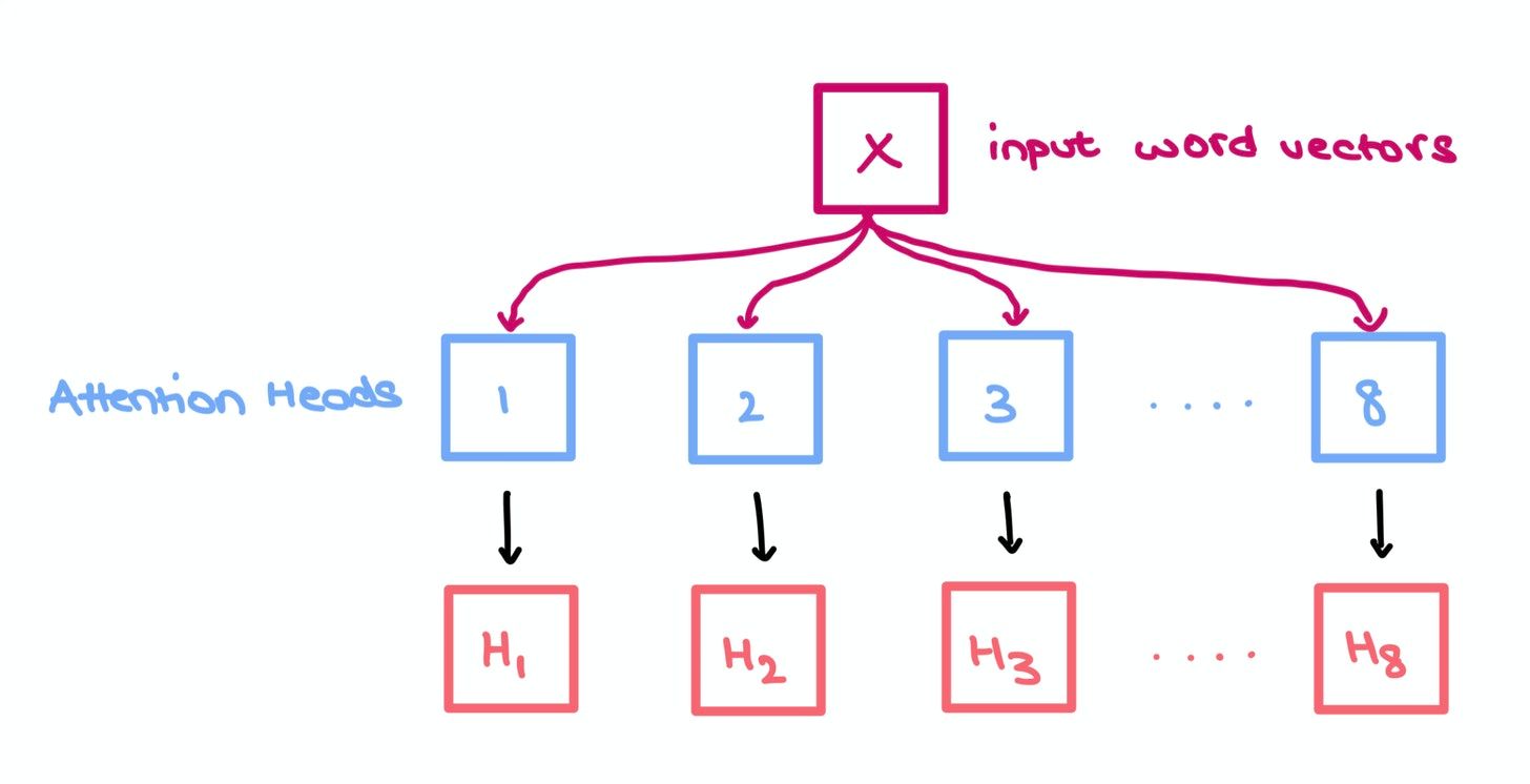 This resulting matrix captures the information of all the heads and can be sent to a Feed Forward layer with hidden layer $J$ for further processing.