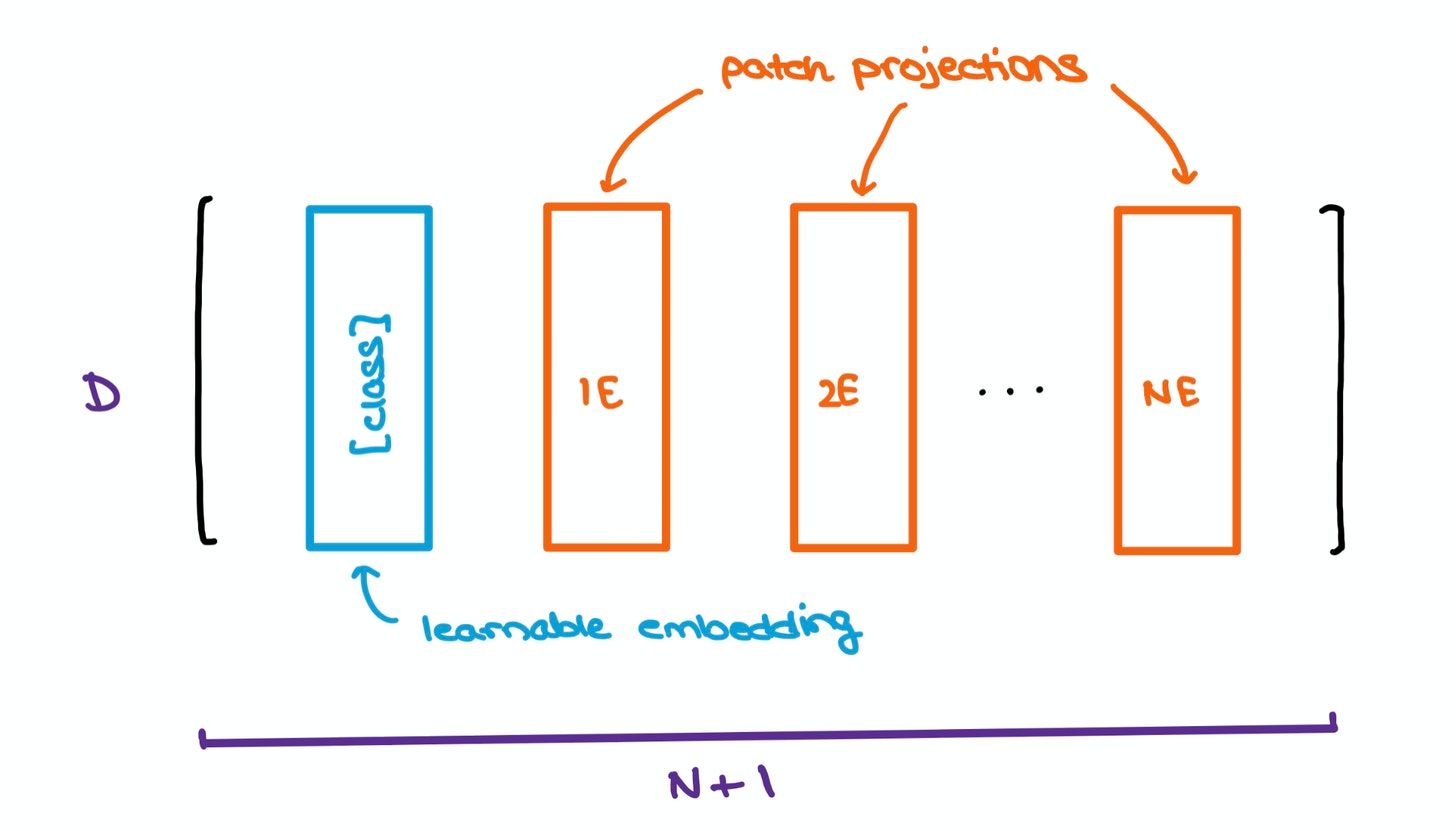 To help with the classification bit, the authors took inspiration from the original BERT paper by concatenating a learnable [class] embedding with the other patch projections. This learnable embedding will be important at a later stage, which we’ll get to soon.