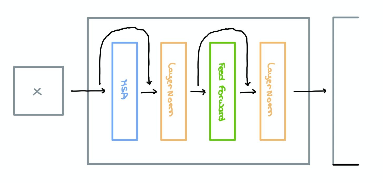 Multi-headed Self-Attention, LayerNorm, and Feed Forward layers are used to form a single Encoder Block as shown below. The original paper makes use of Residual Skip Connections that route information between disconnected layers.