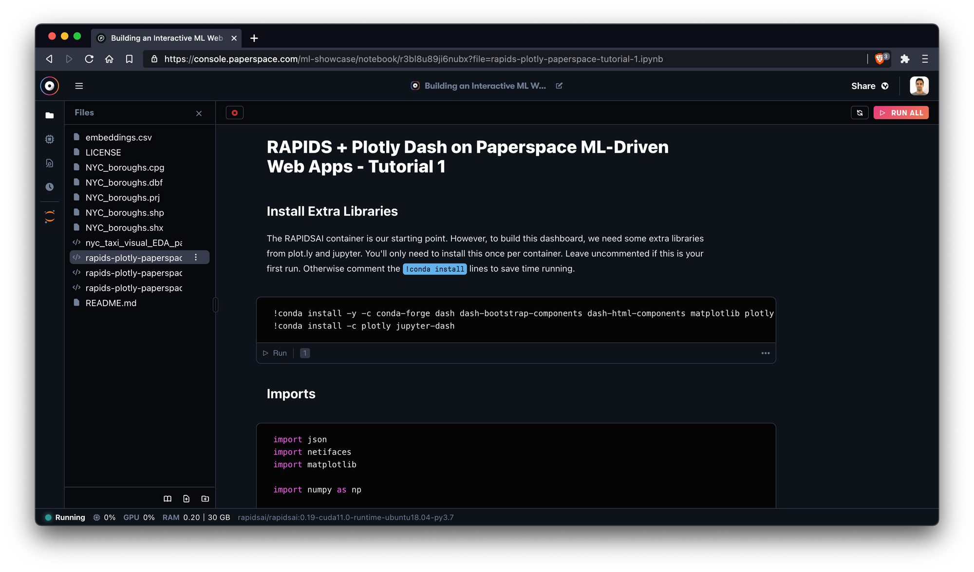 Rapids + Plotly Dash on Paperspace Tutorials 1-3