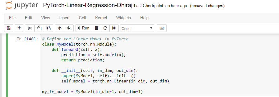 Let us start defining our model by creating a class called MyModel as shown below. Inside the class MyModel we need to define two methods named forward and init. After that we will create the instance of the class MyModel and the instance name here is my_lr_model.