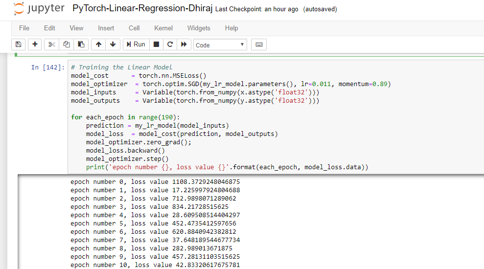 Now we are ready for training the model. Before we start the training we need to define loss function ( here MSELoss), optimizer (here SGD or stochastic gradient descent), and then we have to assign learning rate (0.011 in this case) and momentum (0.89).