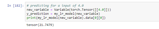 After the model is trained, the next step is to predict the value of a test input. Here we consider an input value of 4.0, and we get a prediction (output) of 21.75.